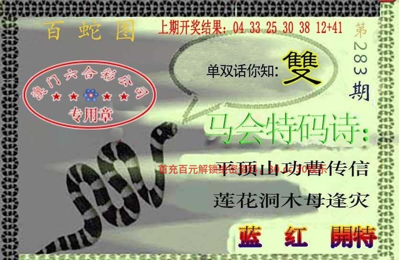 283期解百蛇图:平顶山功曹传信,莲花洞木母逢灾 六肖中特:马猴牛龙鸡羊 双波中特:蓝红波 |